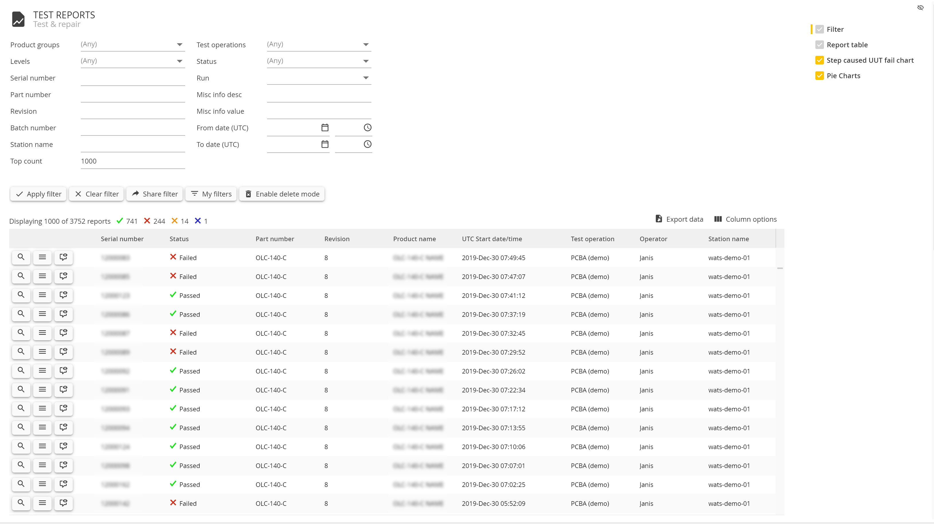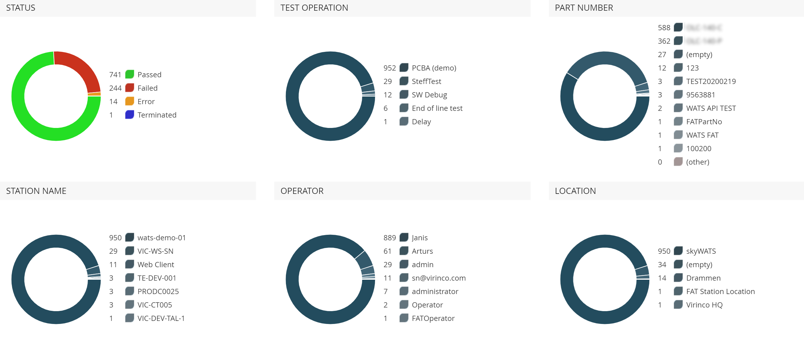 In the pie-chart summary you can inspect the distribution of reports, based on the parameters: status, test operation, part number, station name, operator and location.