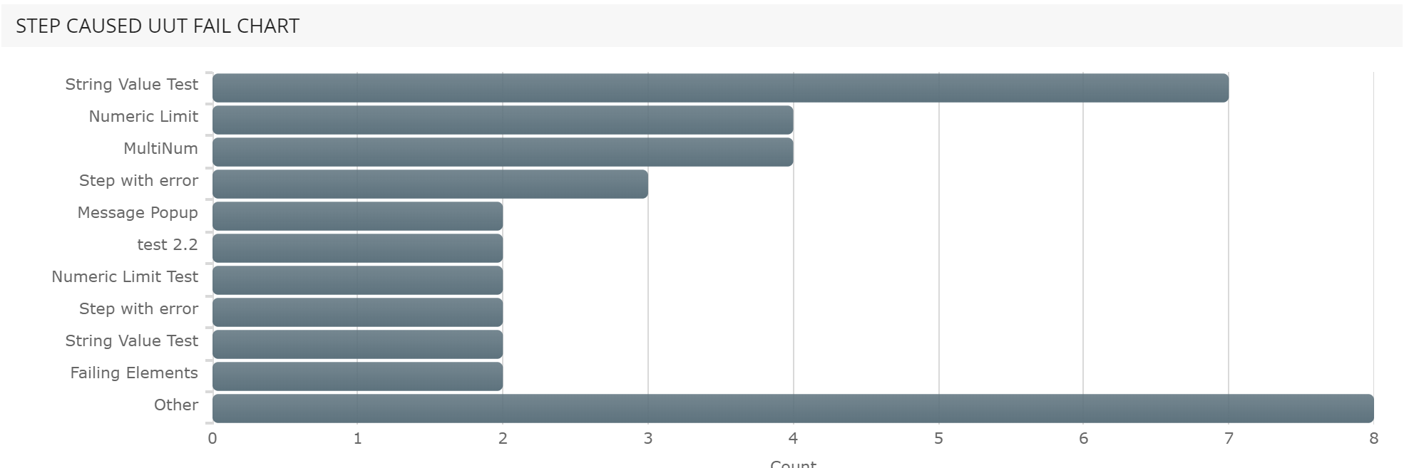 The step caused UUT fail, shows an ordered bar chart of the top 10 failing steps. By hoovering over a bar you can see details about the step. If you have more then 10 failures in your data set these are summarized in the bar Other.