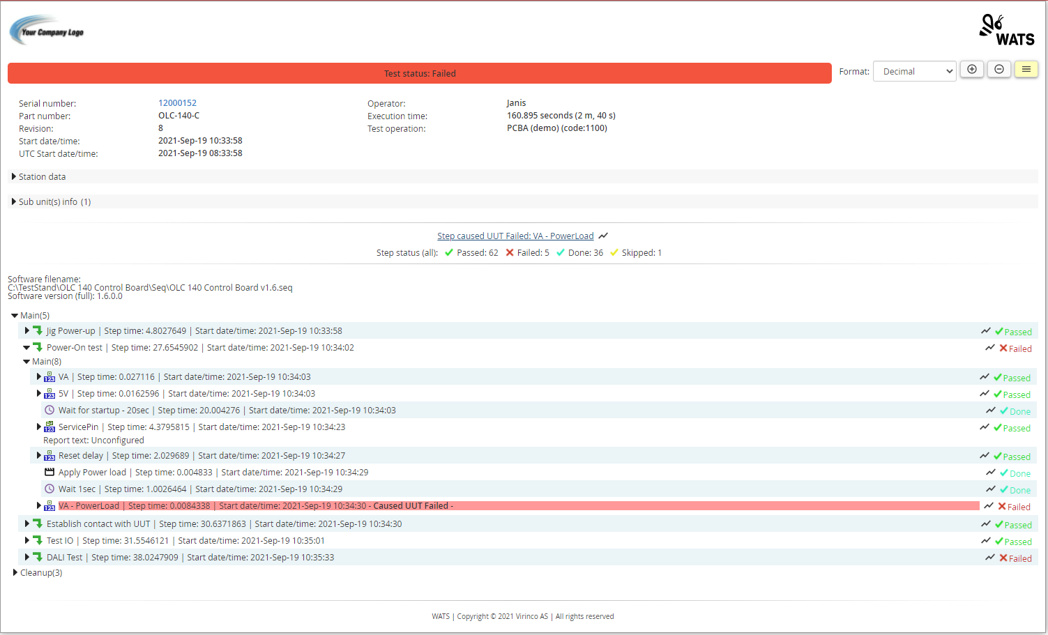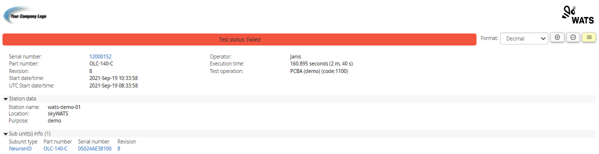In the header you will find information regarding the serial number, part number and revision, as well as the date and time, execution time and operator. The header will be formatted with colors representing the report status.