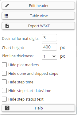 The step list shows a expandable view of the test sequence. You can use the + and - icons in the report menu to quickly expand or collapse all steps. Expand or collapse rows by clicking the row.